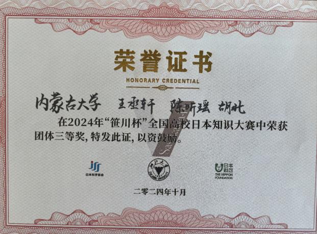 我院日语系2022级研究生胡北同学、2022级本科生王丞轩同学、2022级本科生陈昕瑶同学代表内蒙古大学参加了此次比赛,荣获团体三等奖和个人优秀奖;指导教师孟宪娣老师荣获杰出指导教师奖。