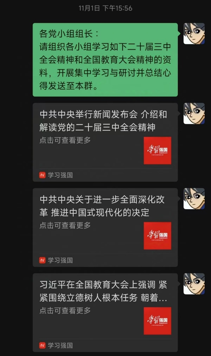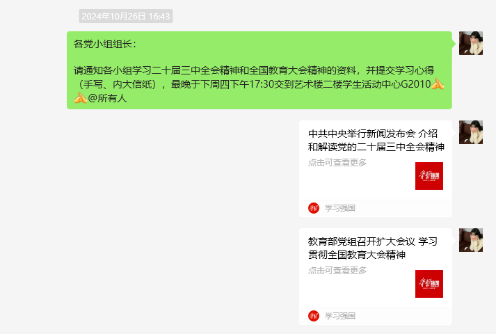 10月30日,研究生第二党支部各党小组分别对二十届三中全会精神和全国教育大会精神相关资料的集中学习与研讨,并以党小组为单位总结相关内容与心得体会。通过以上一系列学习,支部成员们将各项精神与理论内化于心,对学习内容有了更加深刻的理解,更好地指导实践,在学习、工作和生活中更好地践行相关理论。