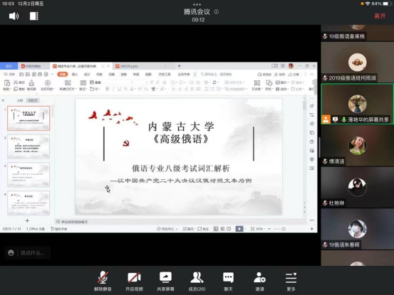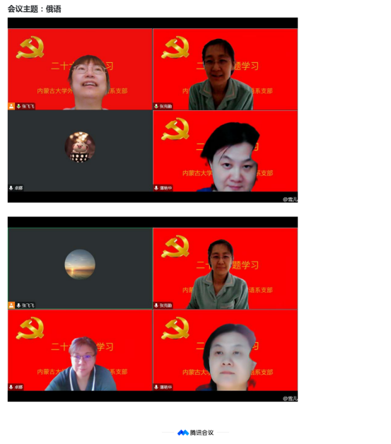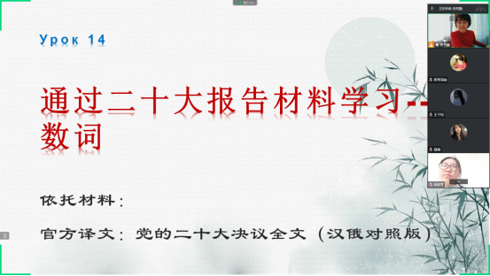 活动期间,四位教师于12月1日和8日先后组织两次线上集体备课。第一次主要是确定活动内容和方式,讨论如何将二十大报告精神自然融入到课堂,既能对员工起到思想教育作用,又能让员工在专业上有新的收获。第二次主要是对二十大报告和决议的中俄双语版本进行讨论,选定适合不同年级学习的词语和语句,探讨翻译方法,交流学习心得。