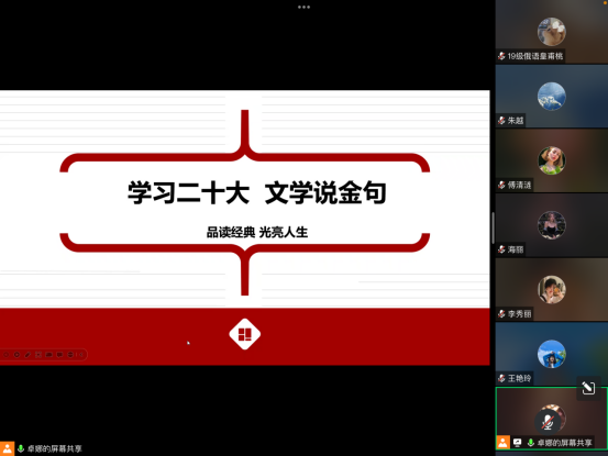 卓娜老师教授20级俄语本科班的《俄罗斯文学史》,员工刚刚开始接触俄罗斯文学,对其中的名言金句较为感兴趣,非常适合通过引入中文实例,培养其思辨能力。她在认真研读党的二十大报告中俄双语版本后,通过金句板块引导员工发展语用能力和培养思辨能力,将思政元素“溶盐于水”,变单一文学史知识的传授为知识、能力、素质的并行引导,极大地提升了员工的学习兴趣。