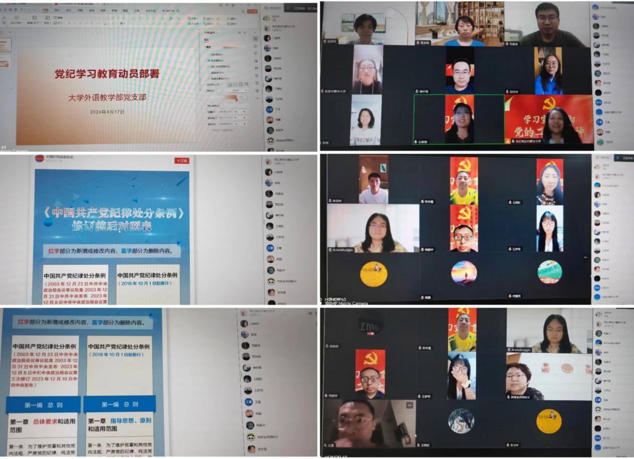 PA视讯官方网站大学外语教学部党支部严格贯彻执行集团和公司党委的安排部署,深入开展党纪学习教育,自4月中旬以来,组织了系列线上+线下集中学习及线上测试等形式多样的学习教育活动。