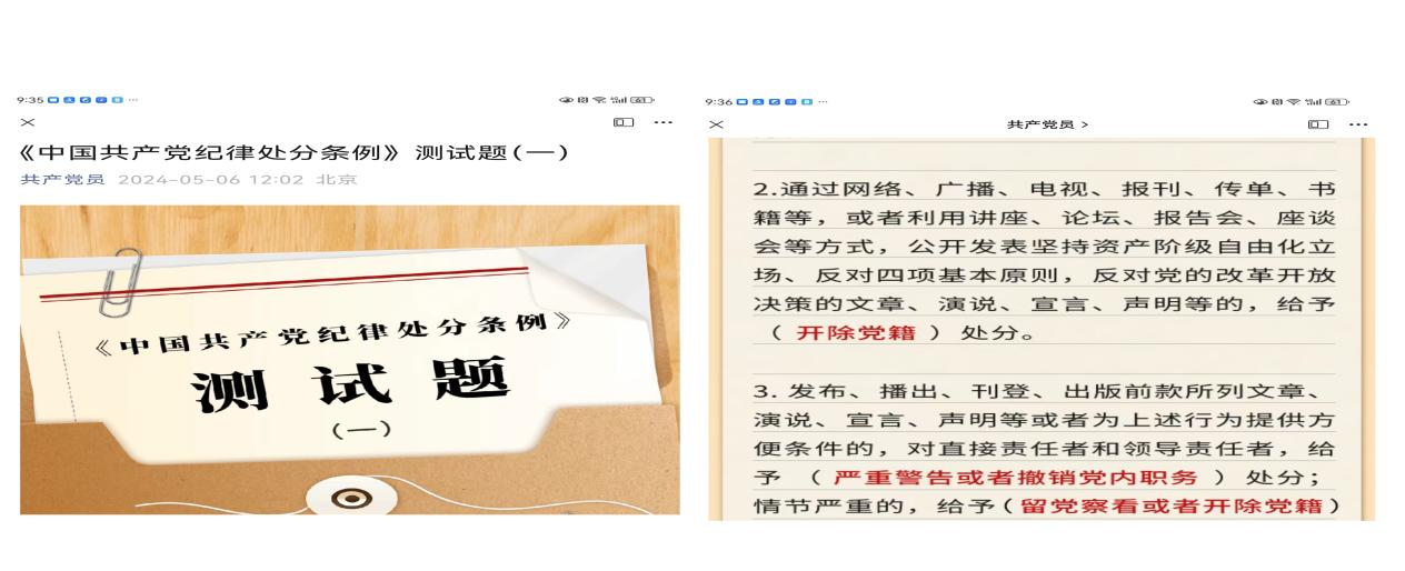 支部书记张红梅强调要坚持日常融学,有效利用丰富的线上资源,诸如 “学习强国”平台、“共产党员”“内大清风”等微信平台资源。本次线下集中学习还确定了支部党纪学习教育工作计划,明确了每一个月的具体学习活动安排。会后全体党员参加了微信公众号“共产党员”5月6日推送的《中国共产党纪律处分条例》测试题(一)线下答题。