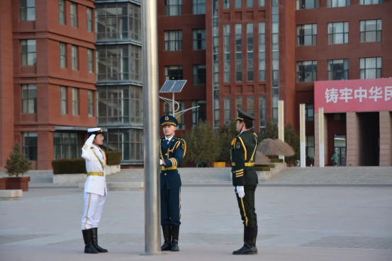 旭日东升,脚步铿锵。朝阳下,旗手英姿飒爽,昂首阔步,迈着坚定的步伐,护送国旗走向升旗台。在庄严的国歌声中,全体师生眺望着国旗冉冉升起,齐唱国歌,面向国旗行注目礼。