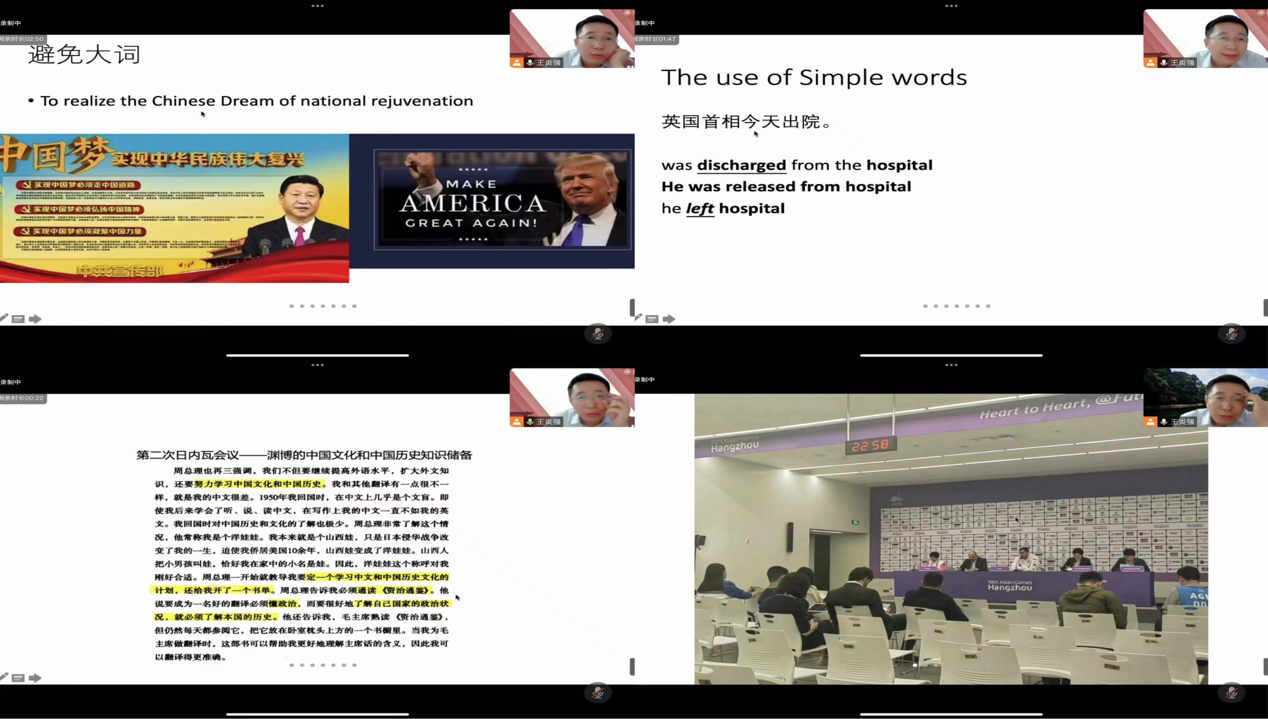 王教授进一步讲述了如何将汉语表达方式转换为英语表达方式。首先,需要理解汉语中的句子结构和词汇含义,以便更好地理解和传达信息。其次,需要注意汉语中的范畴词和补充性词汇,如“规划和实施”等。此外,还需要注意汉语的大词和小词的使用,以提高交流效果。最后,作为一名口译人员,需要具备丰富的知识和文化背景,以便更好地应对各种场景。讲座中,王教授还重点讲授了关于术语,语音,语速,以及数字口译时可能遇到的困难,并结合具体的口译实例讲述了相应的解决方法。