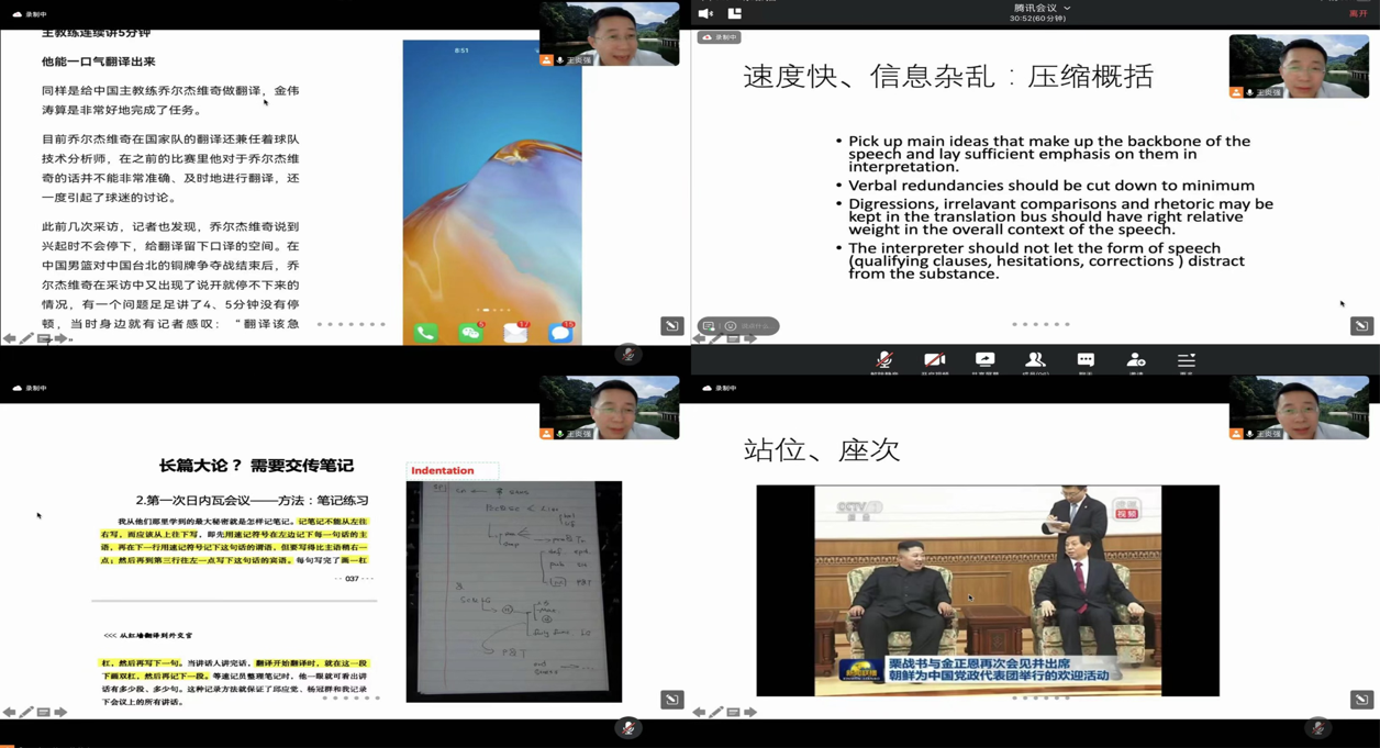 讲座的主题为“口译职业素养与口译临场应对策略”。王教授从口译工作的特点和工作要求出发,主要讲述了如何进行口译活动和掌握信息分析能力。首先,要有良好的听力基础,以便理解和传递信息;其次,要对所翻译的内容有深入的理解,尤其是词汇和文化背景;最后,要保持逻辑清晰,避免误解和歧义。同时,还需要具备一定的思辨能力,能分辨主次、抓住关键点,以达到准确传达原意的效果。