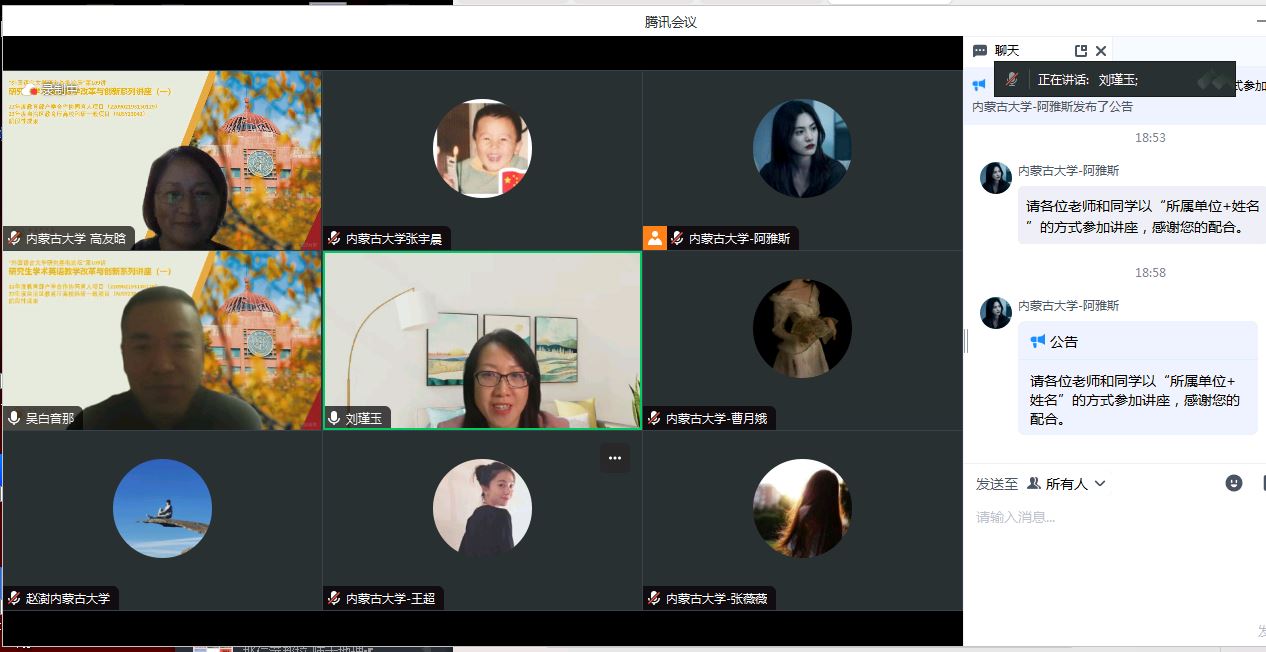 此次讲座邀请到了内蒙古师范大学的吴白音那教授,吴白音那教授从事二语习得、英语教学研究多年。PA视讯官方网站副经理刘瑾玉、大学外语教学部主任赵澍、大学外语教学部支部书记张红梅参加此次讲座,此外,大外教学部各教研室主任、研究生教研室全体教师、其他各教研室教师及本院研究生、来自内蒙古师范大学的师生共计百余人参与了此次活动。讲座的主场会议采用腾讯会议形式,工作坊活动结合线上会议和专用邮箱征集教学教案及问题的形式开展。