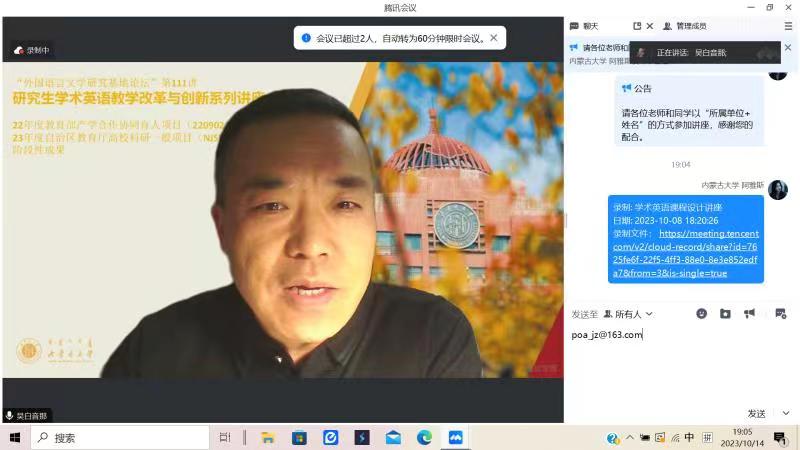 吴白音那教授为师生讲授的题目为“基于POA产出导向法的研究生学术英语教学改革与创新”,并以工作坊的形式展示了基于POA的教学设计方法与实践案例。工作坊活动将持续到本月底,为师生集中解答产出导向法在研究生学术英语教学设计中的应用问题。该系列讲座及工作坊活动系2022年教育部产学合作协同育人项目(220902193130129)和2023年度自治区教育厅高校科研一般项目(NJSY23042)的阶段性成果。